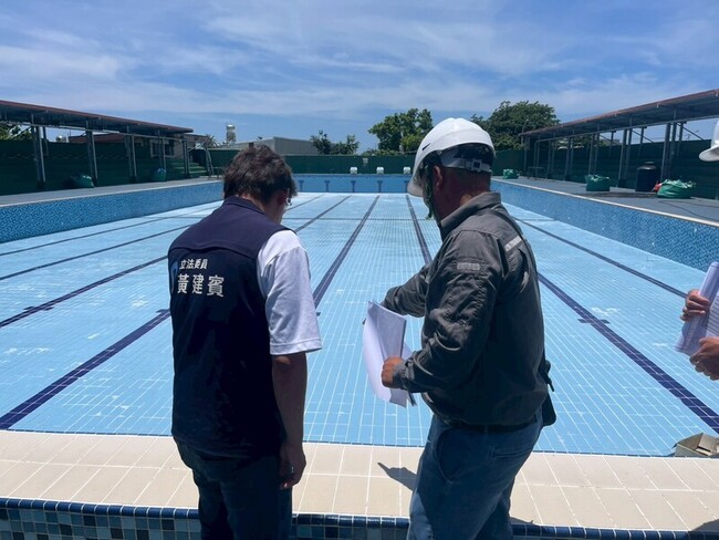 黃建賓表示,昨天他前往兩校會勘整修工程,台東高中游泳池整修預計於9月中完成,包括新建電動遮陽網、過濾系統更新、溝蓋更新、磁磚填補、清除石灰質沉澱等,未來學生不用再穿襪子游泳,水質也更加提升;校方並表示,新學期有望如期舉辦游泳比賽。