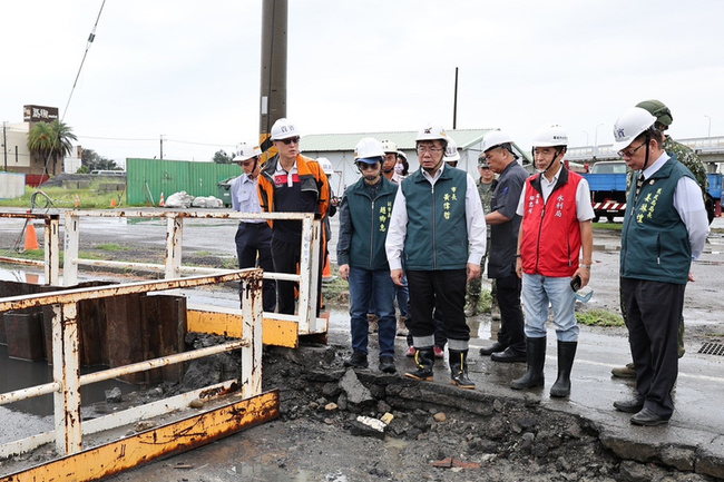 市長黃偉哲上午主持應變中心第1次工作會報後,前往南區灣裡地區視察抽水站工程地點排水情況。