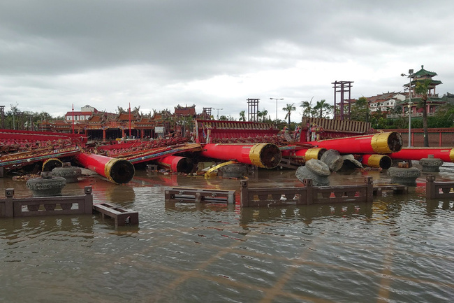 (中央社記者楊思瑞台南7日電)颱風丹娜絲對台南造成災害,沿海地區陣風最強達16級,北門區南鯤鯓代天府知名地標大牌樓,於昨晚11時許倒塌;信眾感到不捨,今天廟前雖有積淹水,仍有不少人前往關心。