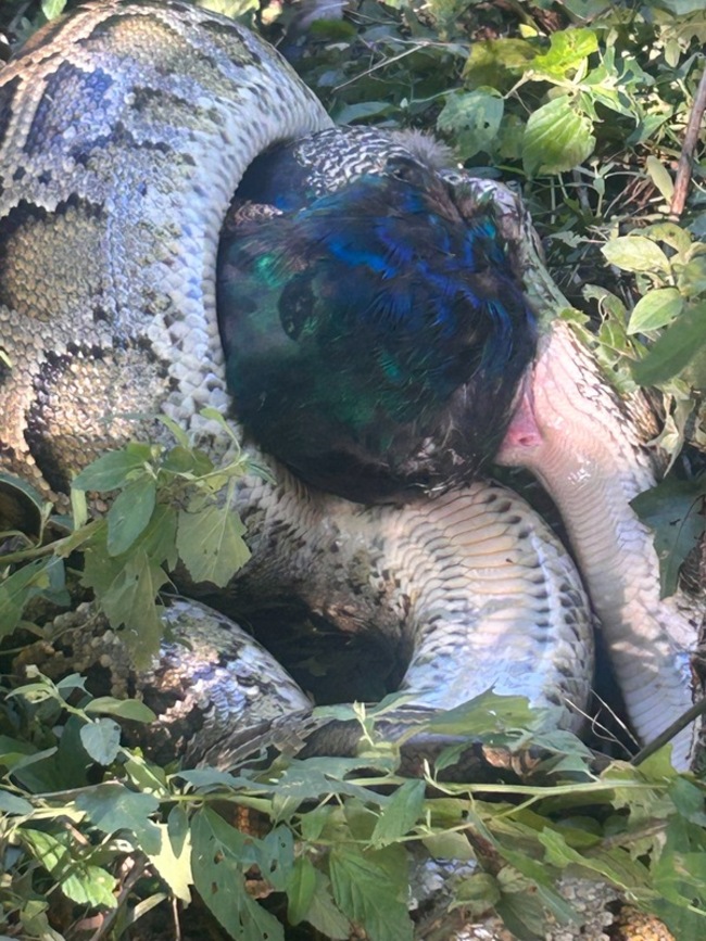 王明宗說,他本想前去救孔雀,但靠近後蟒蛇似乎受到驚嚇就鬆開孔雀離去,而孔雀已經死亡;他說,當發現這隻蟒蛇失蹤,「我也是感覺到有點害怕,萬一在這個地方又出現咬到人那真的很不好」。