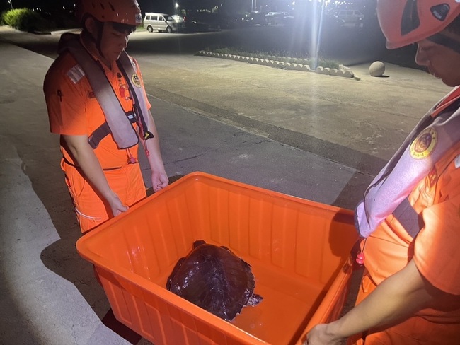第七岸巡隊表示,獲救脫困海龜,為保育類的「欖蠵龜」,海龜背甲長約46公分、寬約50公分,海巡人員與農漁局聯手先妥善安置於岐頭安檢所,並26日交由海洋保育站人員,轉送至農業部水試所澎湖漁業生物研究中心海龜收容中心,進行後續照護。