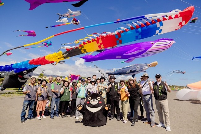 陳其邁下午著花襯衫出席,推薦在地好吃美食及好玩景點,還與吉祥物「高雄熊」在巨型紫鯨等風箏前擺拍,示範主題風箏網美照姿勢,邀民眾暢遊旗津區。