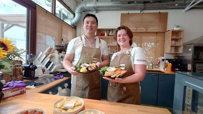 (中央社記者蔡智明嘉義縣11日電)台灣青年胡貽琮3年多前遠赴烏克蘭計畫創業開珍珠奶茶店,並與烏克蘭女孩相戀結婚,不料遇俄烏戰爭,為躲避戰火只好回台開餐廳,讓烏克蘭美食在嘉義飄香,饕客接踵而來。