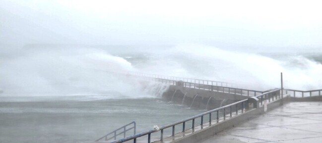 澎湖氣象站下午2時許,觀測到澎湖海域出現10級以上的陣風,西嶼地區更觀測高達13級,海上掀起巨浪,拍及堤岸,在強風的助勢下,捲起浪花四濺,部分較低漥地區,海浪打上陸地。