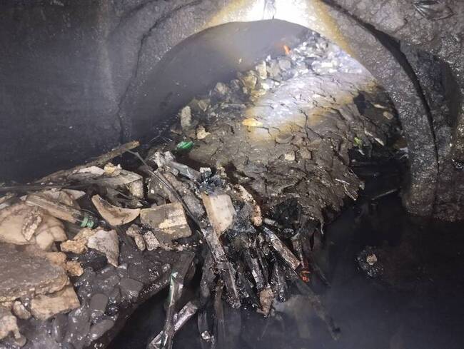 (中央社記者蔡孟妤高雄14日電)颱風楊柳影響,高雄市楠梓區昨天一處人孔蓋因豪雨位移,造成女騎士摔車。市府水利局今天派工將人孔水抽乾,發現下水道連接管遭混凝土阻塞,立即進行打除作業,以維持排水通暢。