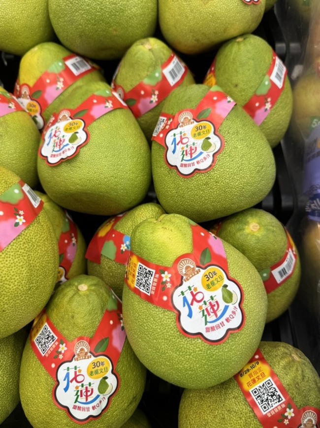 (中央社記者張祈花蓮縣30日電)文旦柚產季到來,花蓮縣府結合地方農會、在地業者及全台零售通路,今年在全台1200多家全聯門市上架,每顆文旦柚都貼上「花蓮30年老欉文旦」標示貼紙,吸引消費者選購。