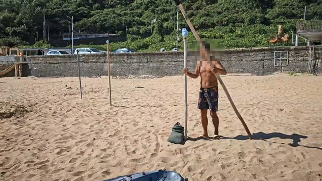 市府產發處副處長黃毅維上午會同警方前往沙灘執法,發現業者在沙灘插著4根木棍並架設客廳帳占地,業者辯稱,客廳帳是要供自己休息使用,自己也是遊客,提問不能在沙灘架設陽傘、客廳帳嗎,木棍不是他的,是他立在沙灘。