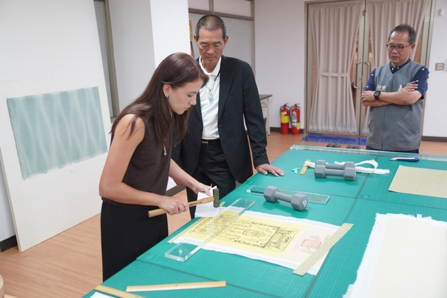 蔡咏鍀說,迪耶茲現為法國巴黎裝飾藝術博物館(Paris Musée des Arts Décoratifs)的紙質文物修復師,迪耶茲在老師的引薦下到北港朝天宮文物修復中心展開為期2個月的紙質文物修復技術交流活動。