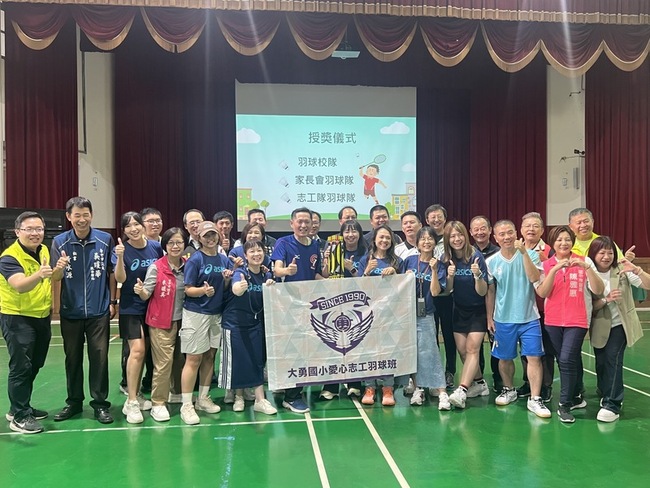 郭明洲表示,12天前何昱奇才捐贈中山國中棒球隊新台幣60萬元,今天又挹注大勇國小羽球隊,市府大力支持羽球等運動,並與學校合作,感謝何昱奇大力協助小朋友,減輕學校及家長負擔,推動羽球運動。