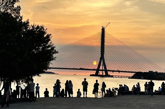 (中央社記者王鴻國新北15日電)月有陰晴圓缺才凸顯不同時期的美與獨特,淡江大橋即將合龍,橋體一小段的缺口殘影將不再,引得網友相揪拍照,也讓淡水海關碼頭及八里左岸成為夕照取景熱點。