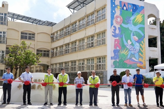 (中央社澎湖縣30日電)澎湖中興國小新建「行走浪花的美好」公共藝術今天啟用,宣告澎湖的校園藝術教育邁入新的里程碑,讓校園圍牆不再冰冷,增添美感。