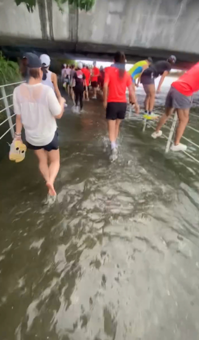當選手跑到傳藝大橋下時,發現冬山河水位已溢出河道,淹沒到自行車道,高度約到腳踝,長度有數十公尺,有選手選擇直接通過,也有選手脫下跑鞋涉水,還有部分選手攀爬欄杆通過。