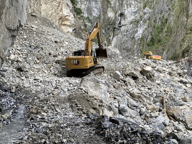 (中央社記者張祈花蓮縣25日電)花蓮立霧溪燕子口堰塞湖水位穩定,林業保育署花蓮分署委託廠商進行減災工程,施工便道今天已推進到壩頂,將進行降挖作業。
