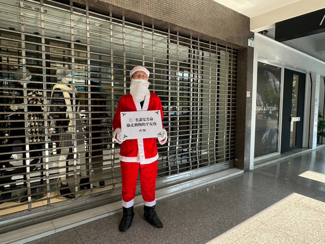 亞洲善待動物組織(PETA Asia)今天在該品牌高雄門市前進行倡議活動,一名身穿耶誕老公公服裝的參與者手持活動標語,呼籲該品牌停止「謀皮害命」,不要偷走動物的平安夜。參與活動人士本來希望能進到品牌門市進行溝通,但該門市尚未營業。