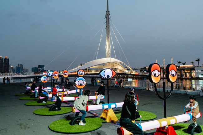 駁二今天發布新聞稿表示,「好奇翹翹板」共有6座互動式翹翹板,由澳洲燈光互動設計工作室Amigo & Amigo打造而成,裝置的巨型眼睛會隨著翹翹板升降轉動,彷彿正好奇地注視,且會發出獨特音效。將為高雄港區增添溫馨又奇幻的繽紛場景。