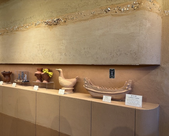 全台唯一考古主題的咖啡廳13 CAFÉ今天也同步開幕,步入店內大片仿文化層牆面映入眼簾,現場也展示十三行博物館與日本、韓國姊妹館締約結盟時的贈禮,包括船形埴輪、人面陶罐等複製品。