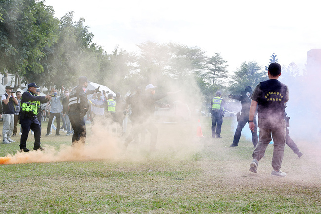 台南市警察局說明,演練情境設定在模擬演唱會進行中,發現歹徒預藏煙霧彈在場中丟擲並隨機傷人,引發群眾騷動,現場執勤員警發現突發事件後,立即圈圍歹徒、控制現場,並由特殊任務警力持辣椒水、臂盾及電擊槍等,制伏行凶歹徒。