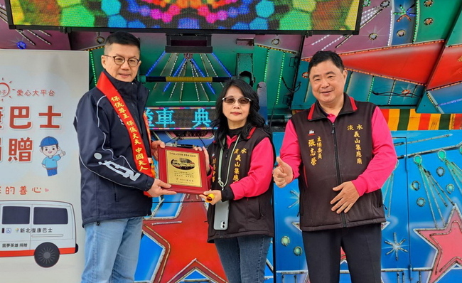 市府社會局表示,淡水區義山集應廟今天安座52週年慶,志工詹淑媚捐贈1輛雙座位復康巴士給新北市,由市府副秘書長張其強代表市長侯友宜受贈。