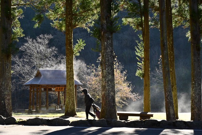 武陵農場人員今天告訴媒體表示,因輻射冷卻效應,今天清晨7時出現零下1.2度低溫,場內草地以及停車場的汽車玻璃都結了一層霜,隨著太陽升起,陽光照射下,氣溫逐漸上升,望溪亭的白霜因陽光照射蒸發,水氣散發飄升白霧。