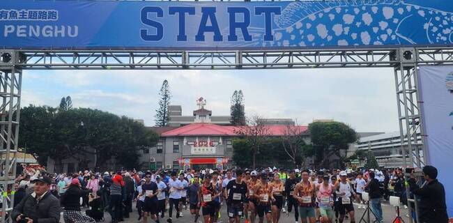 (中央社澎湖縣18日電)澎湖縣2026「Run in Penghu.跑進海洋.年年有魚」海島路跑活動,來自全台各地近2300名跑者今天上午在寒風中起跑,完賽者可獲得1公斤石斑魚。