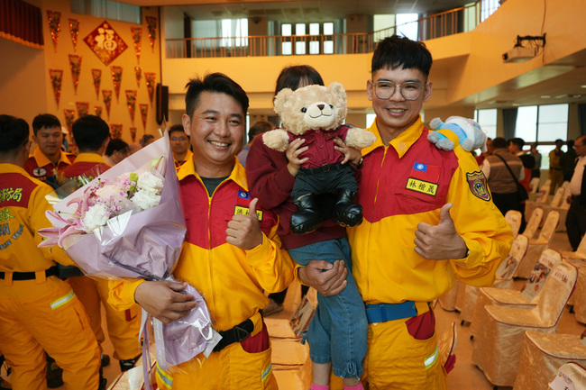 (中央社記者黃郁菁屏東縣19日電)屏東縣消防局今天舉辦119消防節表揚大會,去年花蓮縣光復鄉洪災獲救女童「小沂」驚喜現身,向特搜大隊獻花致謝,並送兔子玩偶給救援她的隊員林楷晟,還說長大要當消防員。