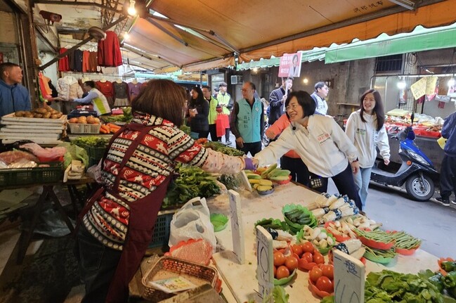 民進黨新北市黨部主委、市長參選人蘇巧慧今天上午在民進黨立委吳秉叡、議員翁震州及議員擬參選人吳奕萱、陳岱吟、翁昭仁等人陪同,一起到新莊市場掃街拜票,獲不少攤商及民眾歡迎。