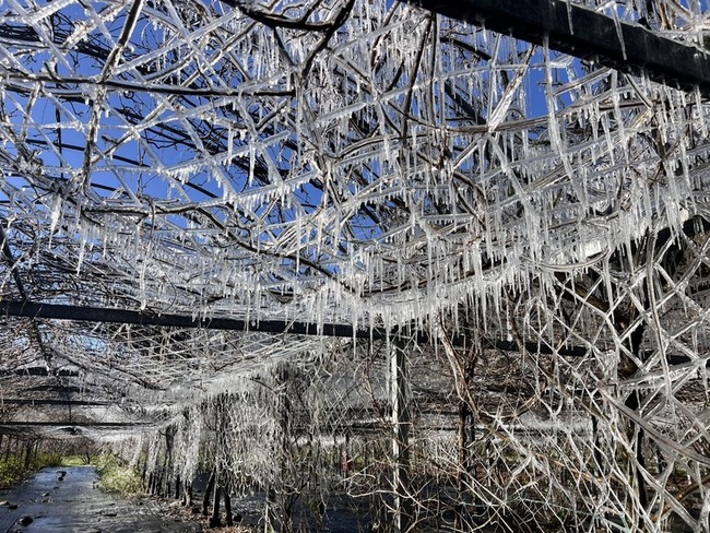 武陵農場今天透過文字稿表示,今天凌晨2時出現零下0.6度低溫,為保護灌溉系統不被凍裂而啟動灑水措施,細小水滴在接觸到藤架與植物瞬間,因極低溫迅速凝結,從藤架上垂下的冰柱形成一道巨大的水晶簾幕,藤花園頓成一座晶瑩剔透水晶宮殿,一早巡園的工作人員直呼,「美到太不科學!」
