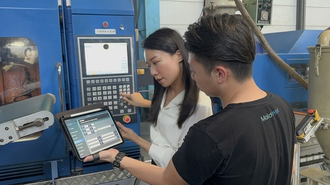 在塑膠射出廠房中,第二代接班人之一的林諺,和負責隆廷實業AI的智穎智能公司執行長張詠翔,正拿出平板電腦蒐集及校對資料,再透過廠房中央螢幕輸入資訊,在大數據疊加過程中,這是必要程序。