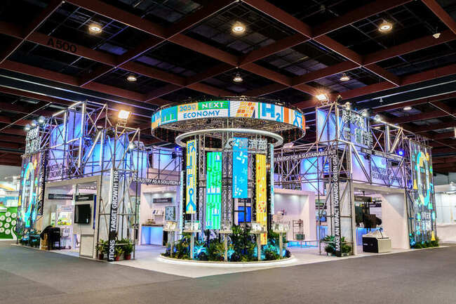 這場展位使用不鏽鋼鷹架、LED 螢幕與模組化系統,大走「賽博龐克」(cyberpunk)風。經工研院協助統計下,發現減碳幅度達93%,而整體設計也榮獲2023 SDGs Asia 綠色設計獎金獎。