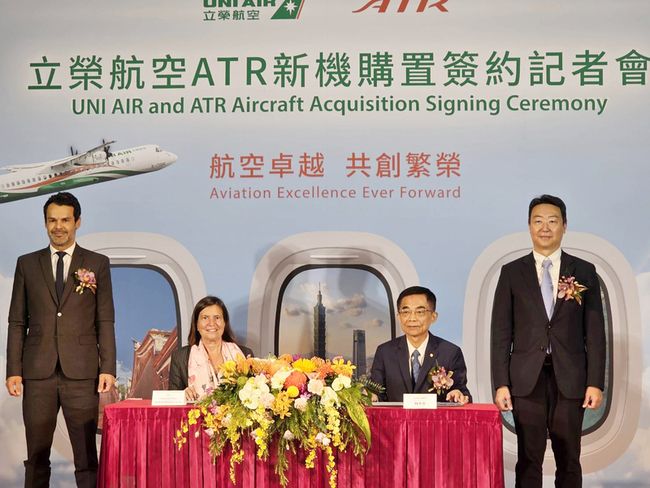 立榮航空今天舉行「立榮航空ATR新機採購簽約記者會」,由立榮航空董事長林志忠與法國Avions de Transport Régional(ATR)飛機製造公司執行長Nathalie Tarnaud Laude共同簽署19架ATR 72-600全新客機的採購合約。