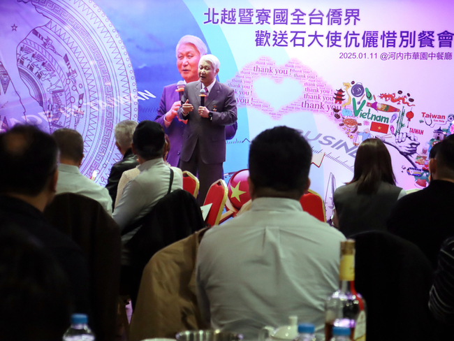 (中央社記者陳家倫河內12日專電)越南僑界11日歡送即將任滿退休的駐越代表石瑞琦,台商爭相在餐敘間合照話別,場面離情依依。石瑞琦盼大家多向越南朋友說台灣的好話,爭取免簽、台灣加入CPTPP及推進台越關係。