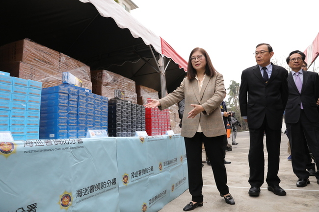 海洋委員會主委管碧玲上午到海巡署南部分署第五岸巡隊,出席海巡署偵防分署查獲毒品工廠及走私大麻、私菸聯合記者會,聽取案件簡報及頒發加菜金勉勵偵辦人員。