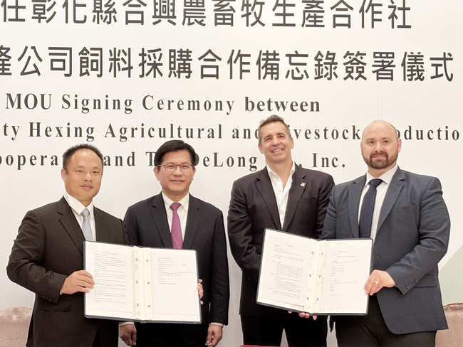 保證責任彰化縣合興農業畜牧生產合作社與美國德隆(DeLong)公司今天簽署飼料採購合作備忘錄,外交部長林佳龍、美國在台協會(AIT)農業組長王睿珂(Erich Kuss)、農業部官員以及立委蔡易餘等出席見證,另有多位產官學界代表與會。