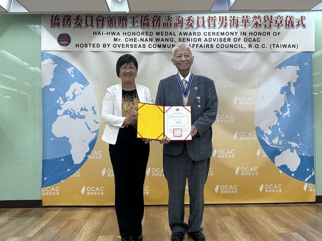 (中央社記者吳書緯台北9日電)僑務委員會委員長徐佳青今天頒贈海華榮譽章予僑務諮詢委員王哲男,表彰其長年協助政府僑務工作與促進台日交流的貢獻。徐佳青表示,王哲男多次促成台日高層會談,為深化台日雙方友好互動盡心盡力。