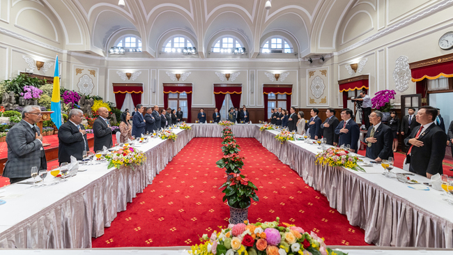 賴總統晚間在總統府設宴接待惠恕仁伉儷及訪團成員,總統致詞表示,他在2022年和去年,2次訪問帛琉,都受到惠恕仁伉儷盛大款待。他穿上花襯衫,受到帛琉人民的熱情歡迎,彷彿回到家裡一般,感到非常溫暖和親切。