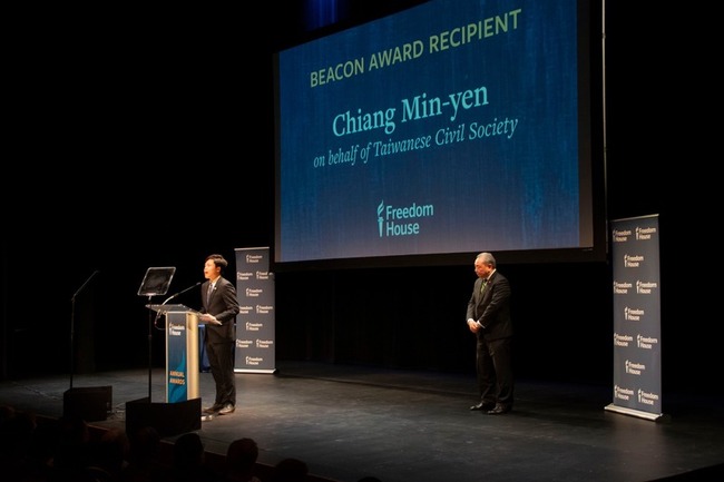 美國老牌倡議團體「自由之家」20日舉行頒獎典禮,其中燈塔獎(The Beacon Award)由前美國駐英大使塔特(Robert Tuttle)頒發。駐美代表俞大㵢代表台灣政府領獎,「科技、民主與社會研究中心」研究員、台灣經濟民主連合智庫青年顧問江旻諺則代表台灣公民社會受獎。