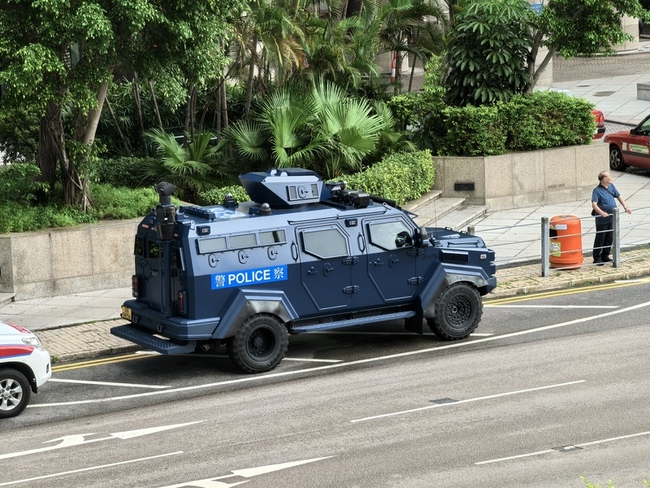 今年的升旗禮跟過去幾年一樣,不設公眾席,而且金紫荊廣場附近戒備嚴密,有大批警員把守,警方還派出裝甲車戒備,反映出港府維安及維穩大於一切。