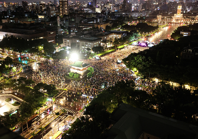 罷團今晚在凱道舉辦晚會,人潮不畏雨勢持續湧進,外溢到景福門;現場旗海飄揚,有中華民國國旗,也有台灣獨立旗;許多人戴著「大罷免、大成宮」帽子,揮舞「同意罷免」布條,還有民眾自製創意標語「飄洋過海來罷免、大罷免大成功」、「海陸挺罷免」、「我愛我那小小多山的國家」。