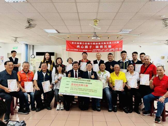 (中央社記者郭建伸台北7日電)中南部遭風災重創仍在復原中,民進黨立委李坤城今天邀集11間三重地區宮廟共同聯合捐款新台幣110萬元。李坤城表示,盼災民能早日回歸正常生活。衛福部長邱泰源親自出席活動,向宮廟善舉表達感謝。