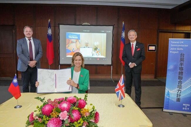 外交部今天發新聞稿指出,姚金祥與包瓊郁(Ruth Bradley-Jones)昨天在外交部政務次長吳志中及英國創新科技部國家科技顧問、博士史密斯(Dr. Dave Smith)的見證下,分別以視訊及實體方式簽署簽署「台英半導體聯合培力計畫瞭解備忘錄」(Taiwan-UK Memorandum of Understanding on the Semiconductor Joint Skills Project)。