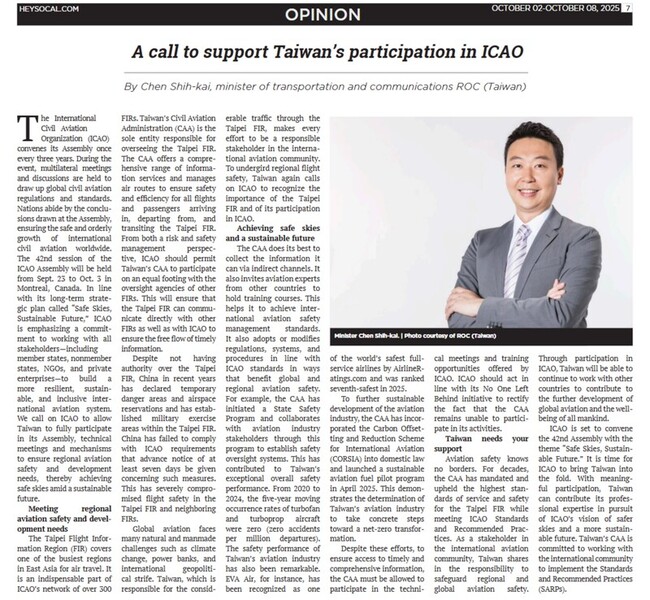(中央社記者林宏翰洛杉磯3日專電)南加州「燈塔媒體新聞」旗下21家城市週報,近日刊登交通部長陳世凱文章,呼籲國際為了全球飛航安全,支持台灣參與國際民航組織。