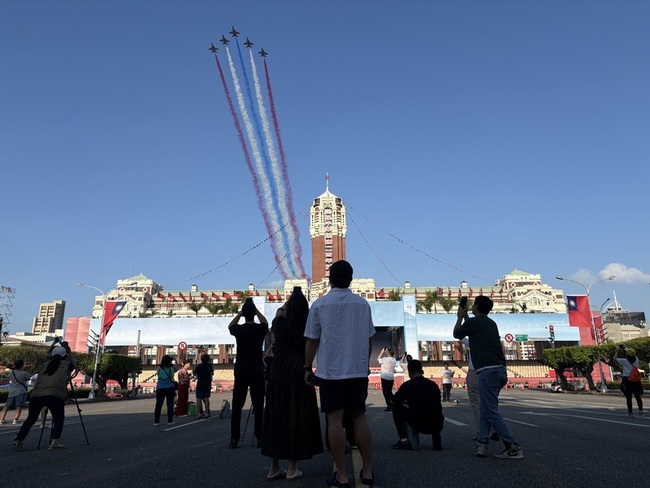 (中央社記者吳書緯台北8日電)雙十國慶即將到來,國軍今天上午進行國慶大會全兵力空中操演,吸引許多民眾在總統府前觀賞,空軍雷虎小組駕駛5架勇鷹高教機噴彩煙飛越總統府上空作為壓軸。