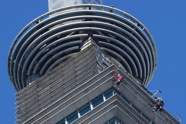 美國自由攀岩好手霍諾德挑戰徒手攀爬台北101大樓,今天上午9時登場,台北天候良好,場外聚集大批媒體及民眾。10時許霍諾德已攀登超過60層樓,10時43分成功登上508公尺高大樓頂端後,揮手向群眾及鏡頭致意。(編輯:蘇志宗)1150125