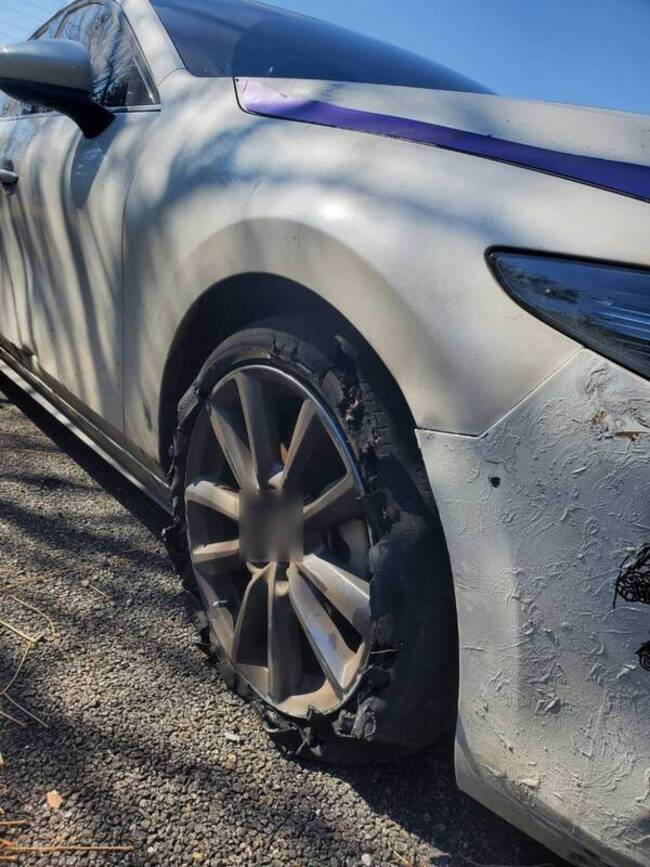 國道公路警察局第2大隊指出,今天中午12時許接獲民眾通報,指國道3號北上153公里處、苑裡路段有1輛車尾保桿嚴重破損的自小客車,緩慢行駛於外側路肩。獲報後,巡邏車前往攔查,員警發現自小客車後保桿破損呈現半脫落狀態,隨時可能斷裂掉落在車道,右前輪更是明顯整圈破裂慘不忍睹。