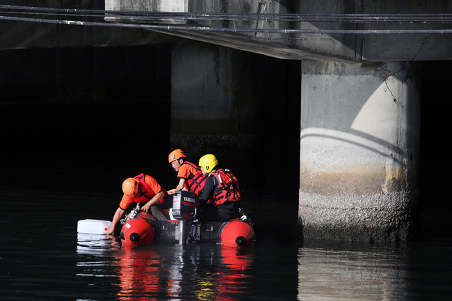 高雄檢警自6日起持續在前鎮區五號船渠、25至27號碼頭及亞灣區周邊搜索打撈遺骸,今天藉中山大學田姓退休副教授提供的聲納設備,在五號船渠一帶鎖定2個疑似圓形物體附近搜索,盼鞏固事證。