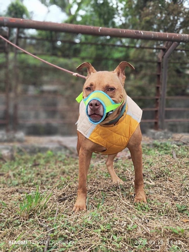 彭正宇說,去年初志工發現「尖石」的攻擊性降低,為讓牠可適應戴上口罩出籠散步,尋求專業訓犬師協助改善,經超過半年訓練後,已能適應戴口罩出籠散步,獲足夠活動空間。