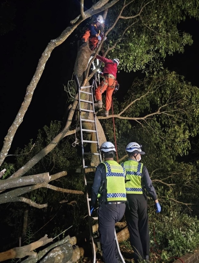 苗栗縣政府消防局第一大隊今天透過文字指出,昨天晚間銅鑼消防分隊接獲通報,指銅鑼鄉慈雲宮附近有民眾疑因鋸樹而卡在樹上失去意識,獲報後立刻派員前往救援。