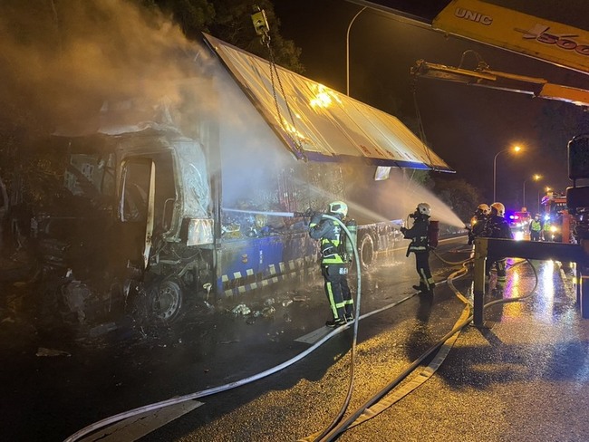 消防人員說,當時物流車頭陷入火海,竄出火舌烈焰,全面燃燒,後車廂緊鎖有大量濃煙且水線無法攻擊到火點,經民間拖吊業者協助以吊臂開啟車廂,出3水線控制撲滅火勢後,發現潘姓駕駛死於駕駛座。(編輯:李明宗)1140327
