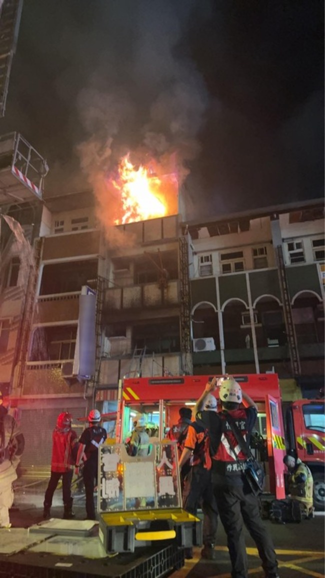 台南市消防局今天凌晨1時55分獲報,北區文賢路冠信香鋪發生火警,立刻派出33車100人及無人機趕往灌救。這棟4樓建築堆放金紙、爆竹及雜物,各樓層都起火燃燒,同時延燒1戶,另1戶受到煙燻。