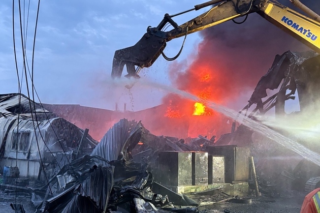 現場因大火不斷冒出濃煙,遠在數公里外都可看見,消防局指出,幸好無人員受困或受傷,火勢在下午3時58分獲得控制,但由於鐵皮建築坍塌,需怪手邊挖邊搶救,現場後續也進駐2台300型重機具(怪手)協助,最終火勢在晚間8時40分熄滅,後續由消防人員進行殘火處理中,至於財物損失及起火原因尚待調查。